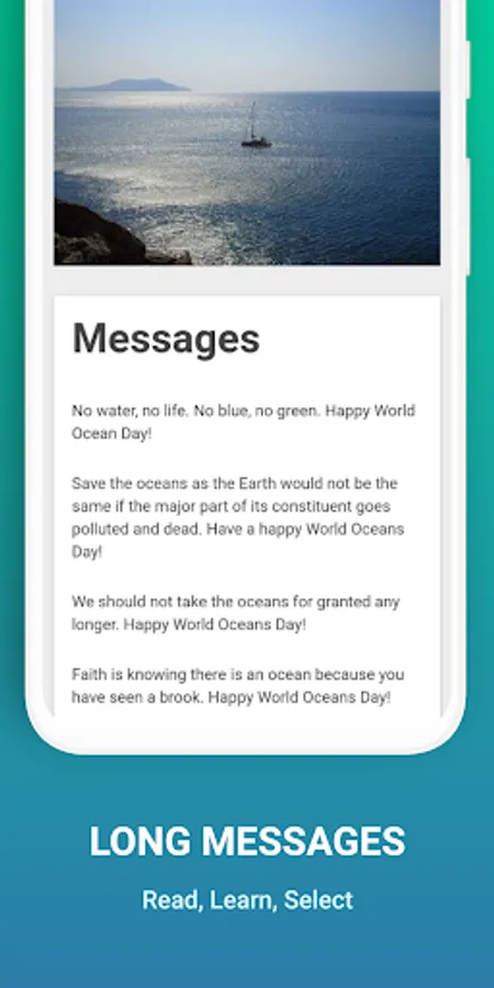World Oceans Day is an app that provide beautiful, interesting and meaningful Quotes, Messages, Photos, Wallpaper along with World Oceans Day green Greetings Messages from influential individual from different background to keep the Oceans Day awareness all day in this Oceans Day with Greetings Cards Wishes Quotes with them. It will be a very convenient apps for you to send your greatest heartwarming wishes for your friend and family anytime and anywhere no matter which part of the world you are in.