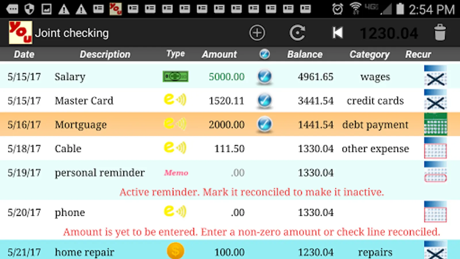 Alerts, reminder lines and recurring income/payments remind you to pay bills, transfer money and more.