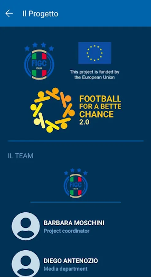 Following its predecessor "Football for a Better Chance", the 36-month European project "Football for a Better Chance 2.0" (FFBC 2.0) aims to promote social inclusion and fight the radicalization of young people aged 14 to 18, thanks to the healthy power of football. To do so, twenty-seven "core activities" plus twenty-five "supplementary technical activities" have been developed by the Italian Football Federation (Federazione Italiana Giuoco Calcio, FIGC) and the University of Modena and Reggio Emilia experts to be implemented on the field. The FFBC 2.0 App will guide coaches in implementing the activities: thanks to this App you will be able to read the activities, select the ones you prefer, organize your training calendar, invite your athletes to the training sessions, monitor your progress within the FFBC 2.0 project and much more.