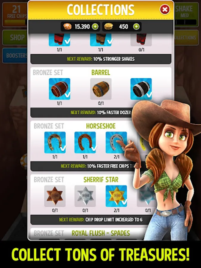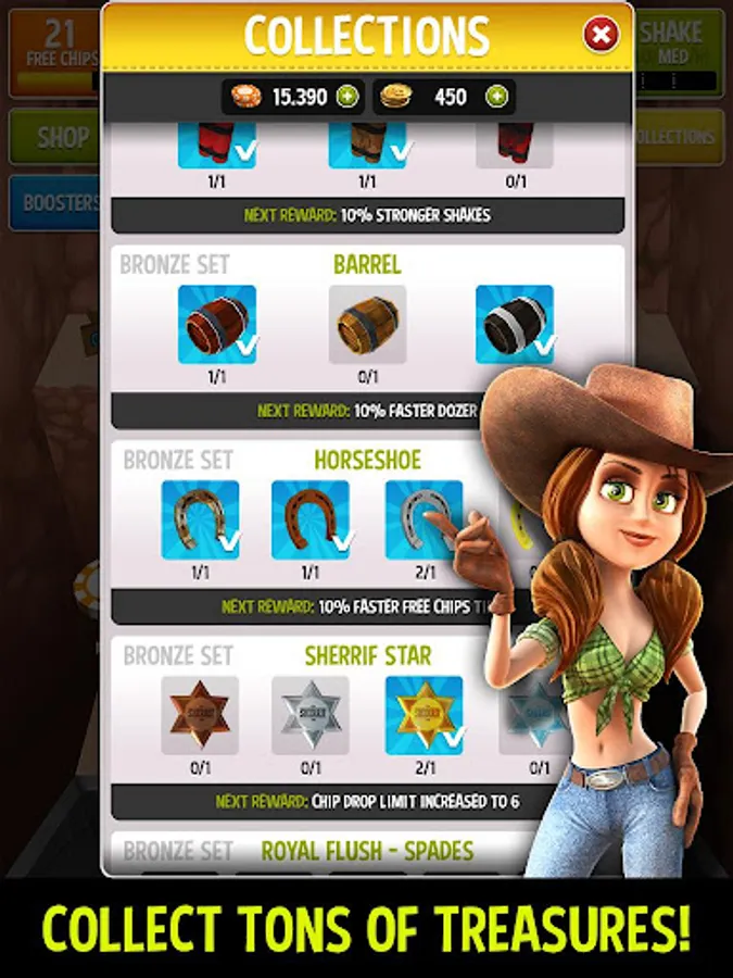 Use the special boosters to win even more. The Chip Wall booster and the Tornado give a great sensation in the game! Collect all treasures and complete the collections to upgrade your coin dozer and features.