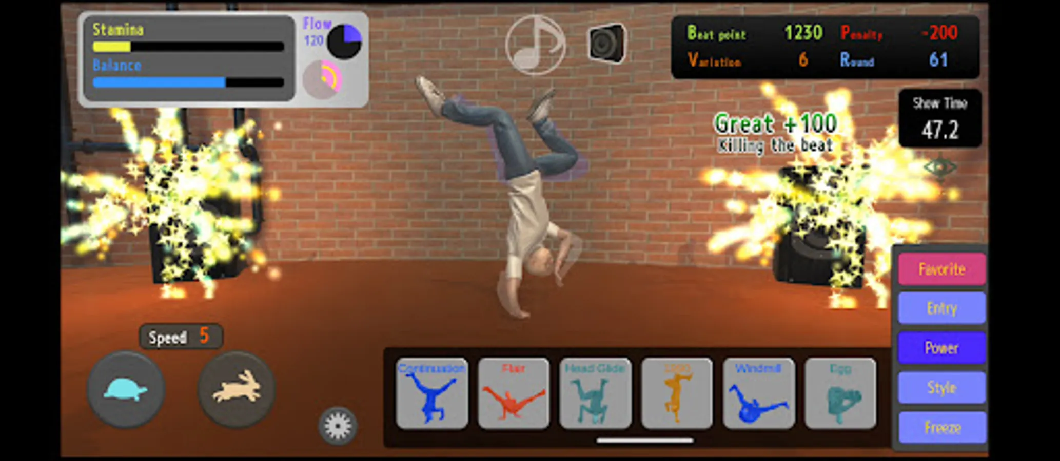 The play system is based on the distribution of stamina and balance, the flow of successfully connecting and storing moves, and the ability to perform moves in time with the sound to earn points.