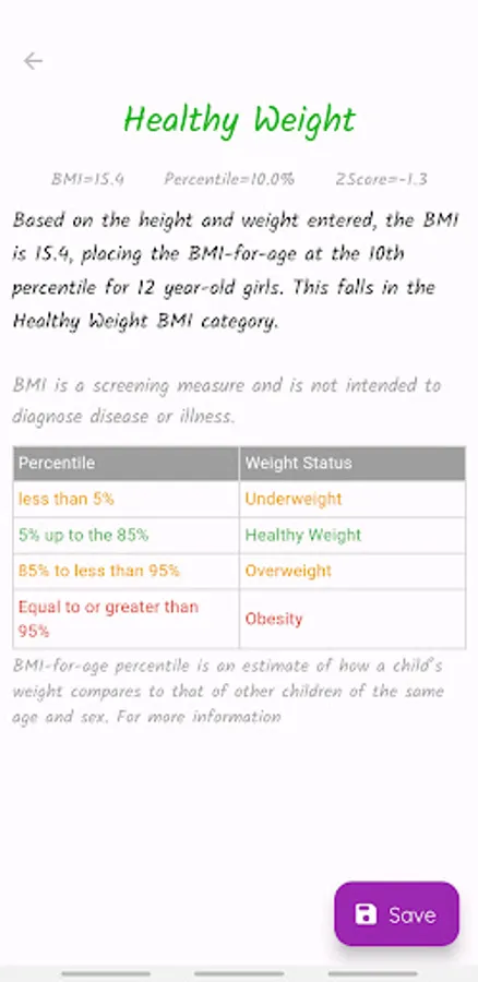 ✓ It computes BMI for children and teens, aged 2 through 19 years old, including Z-Score, percentile and result . With saving and history browsing