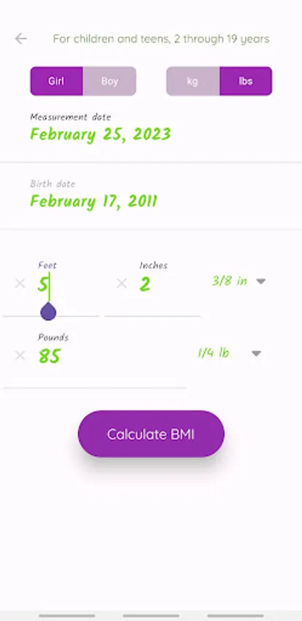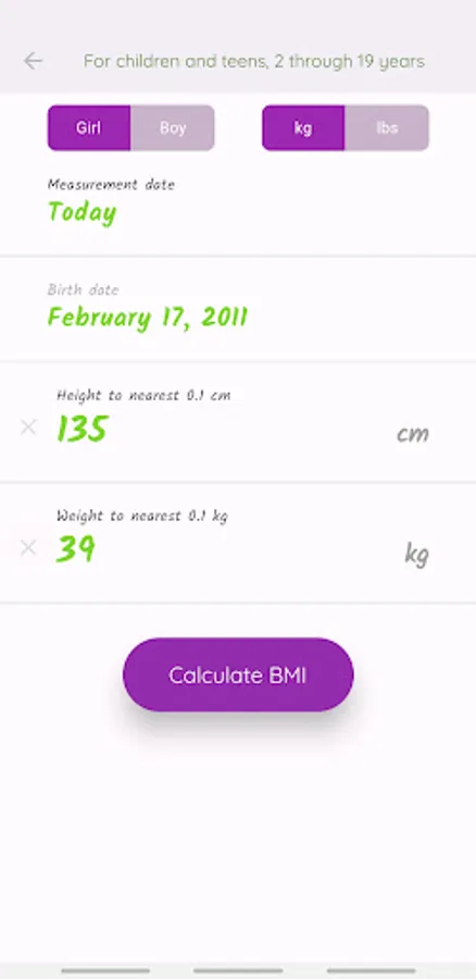 A Child, teen and adult BMI calculator and weight tracker for children and teens from 2 years old through 19 years old. And adults 20 years and older. A Child, teen and adult multi-user BMI calculator/ Weight tracker with very accurate Metric/Standard/English BMI calculator results.