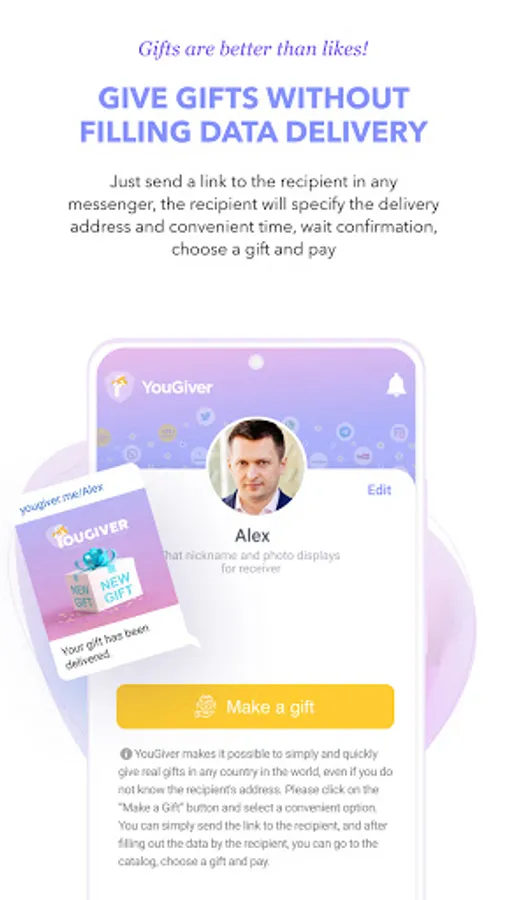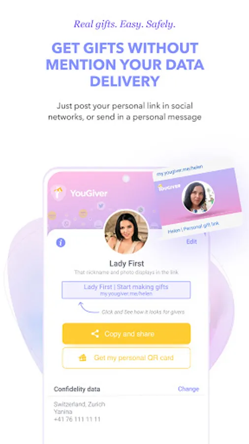If you want to make a gift, start you dialogue in a unique way and send a link to confirm the gift. If anyone wants to make you a gift, don’t reveal your personal information, just send your link.