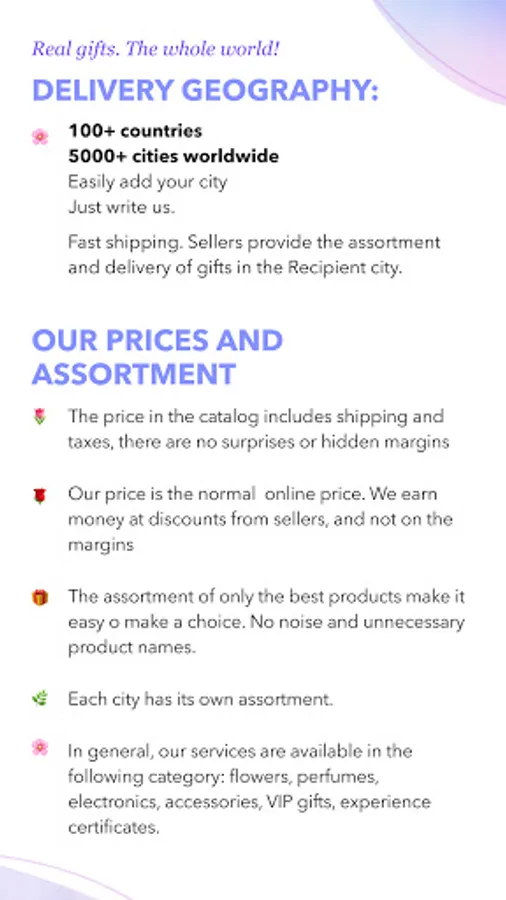 The following product catagories are available in our catalog: flowers, perfumes, accessories, electronics, certificates, VIP gifts.