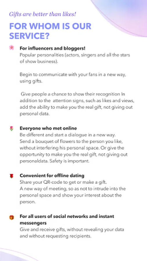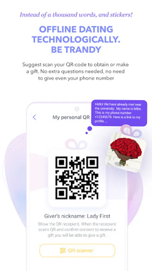 In clubs, restaurants, on the street, whatever life situation just show your QR code to make or receive a gift without getting into personal space and without showing out your personal data.