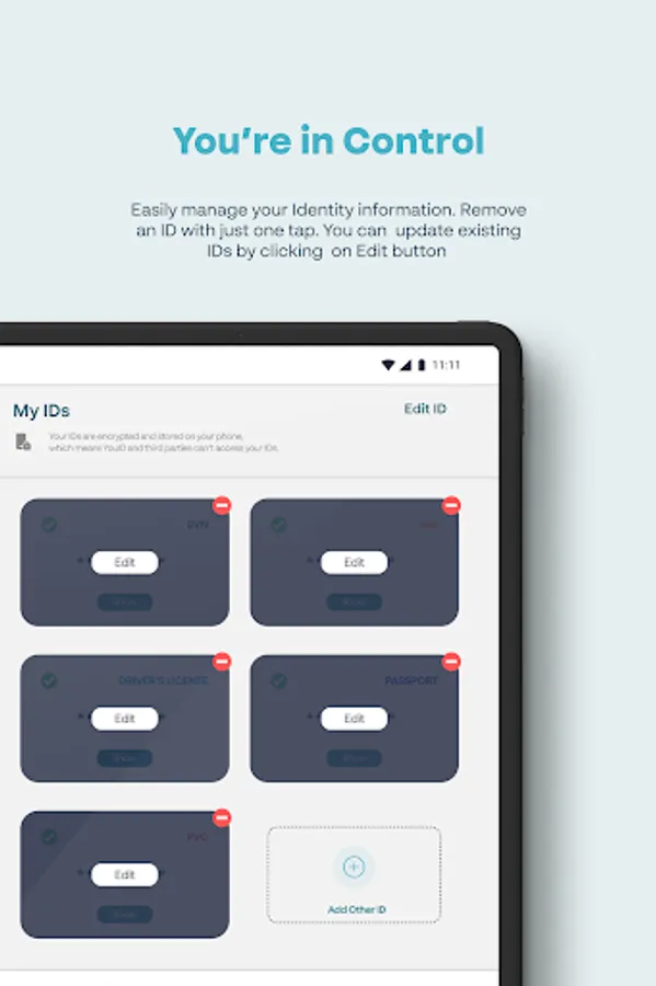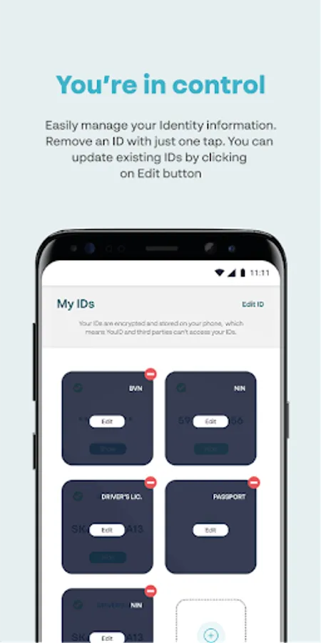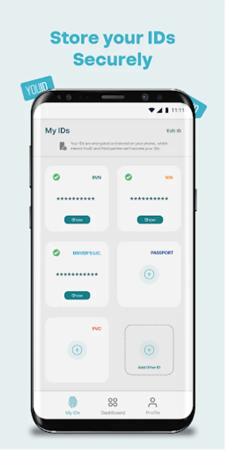 You never have to worry about remembering details on or misplacing your identity cards such as driver’s license or NIN. With the YouID app, all your identity information and personal data can be stored securely and within easy reach whenever you need them.