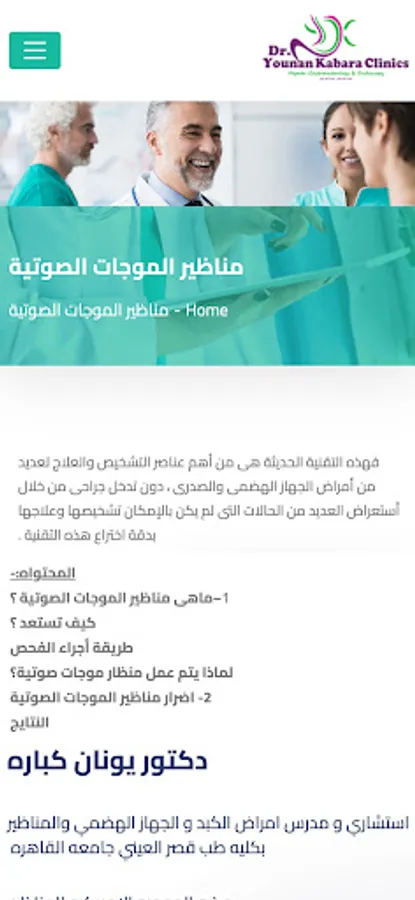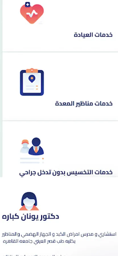 - سِجِّل طبي خاص بك. - ڤيديوهات ما بعد العمليه. - ڤيديوهات طبيه مجانيه. - مقالات مجانيه. - تواصل مباشرةً بالفريق الطبي. عيادات الدكتور يونان كباره إستشاري و مدرس أمراض الكبد والجهاز الهضمي والمناظير بكليه طب قصر العيني, جامعه القاهره. عضو الجمعيه الامريكيه للمناظير. عضو الجمعيه الاوروبيه للمناظير. خبرة أكثر من 8 سنوات. خبرة أكثر من 6500 منظار داخل وخارج مصر.