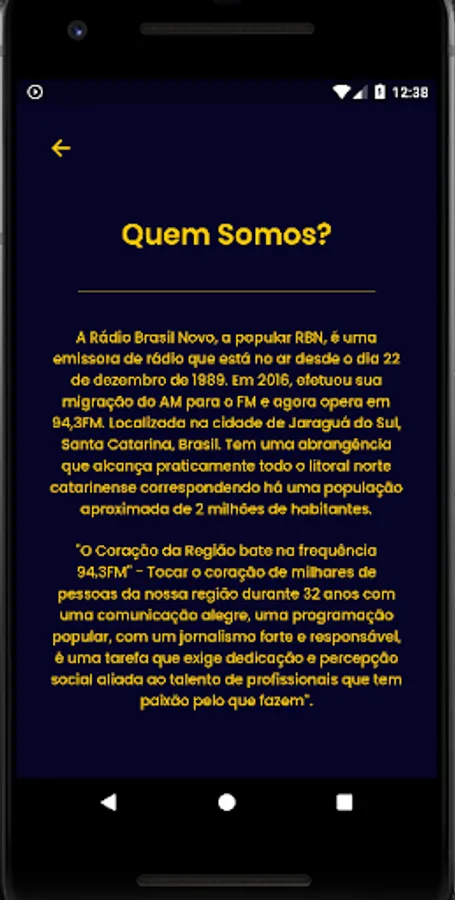 Rádio Brasil Novo, the popular RBN, is a radio station that has been on air since December 22, 1989. In 2016, it migrated from AM to FM and now operates on 94.3FM. Located in the city of Jaraguá do Sul, Santa Catarina, Brazil. It has a reach that practically reaches the entire northern coast of Santa Catarina, corresponding to an approximate population of 2 million inhabitants.
