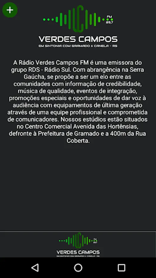 Rádio Verdes Campos FM is a radio station of the RDS group - Rádio Sul. With coverage in Serra Gaúcha, it aims to be a link between communities with credible information, quality music, integration events, special promotions and opportunities to give voice to the audience with state-of-the-art equipment through a professional and committed team of communicators. Our studios are located in the Avenida das Hortênsias Shopping Mall, opposite the City Hall of Gramado and 400m from Rua Coberta.