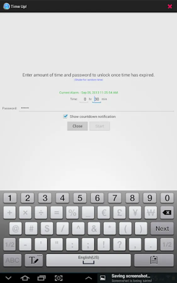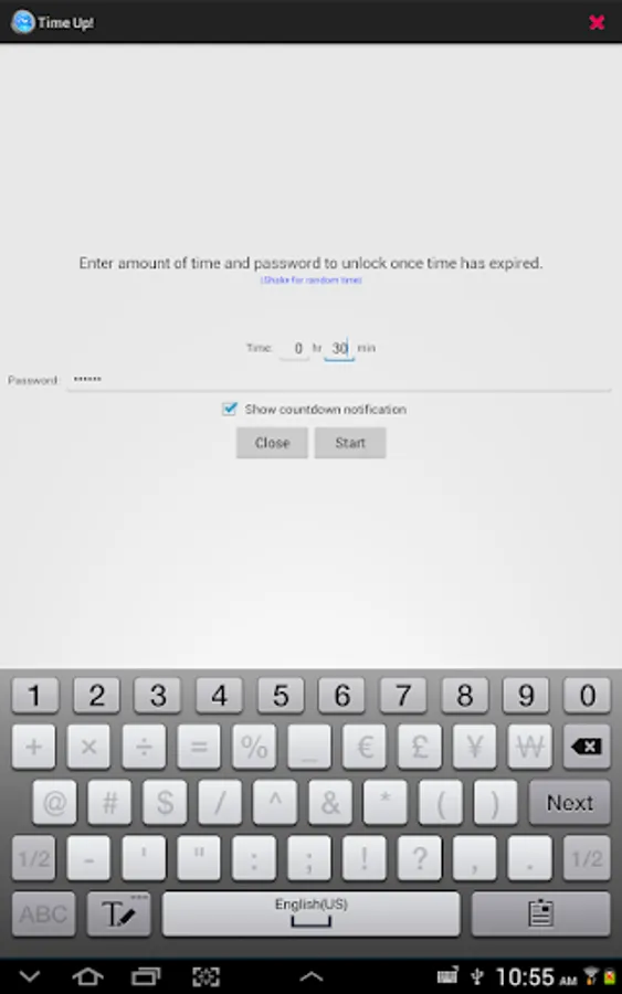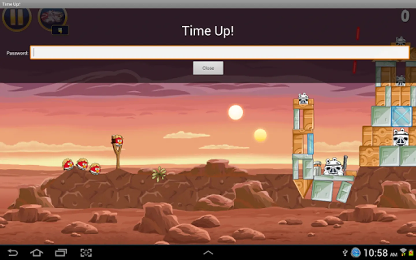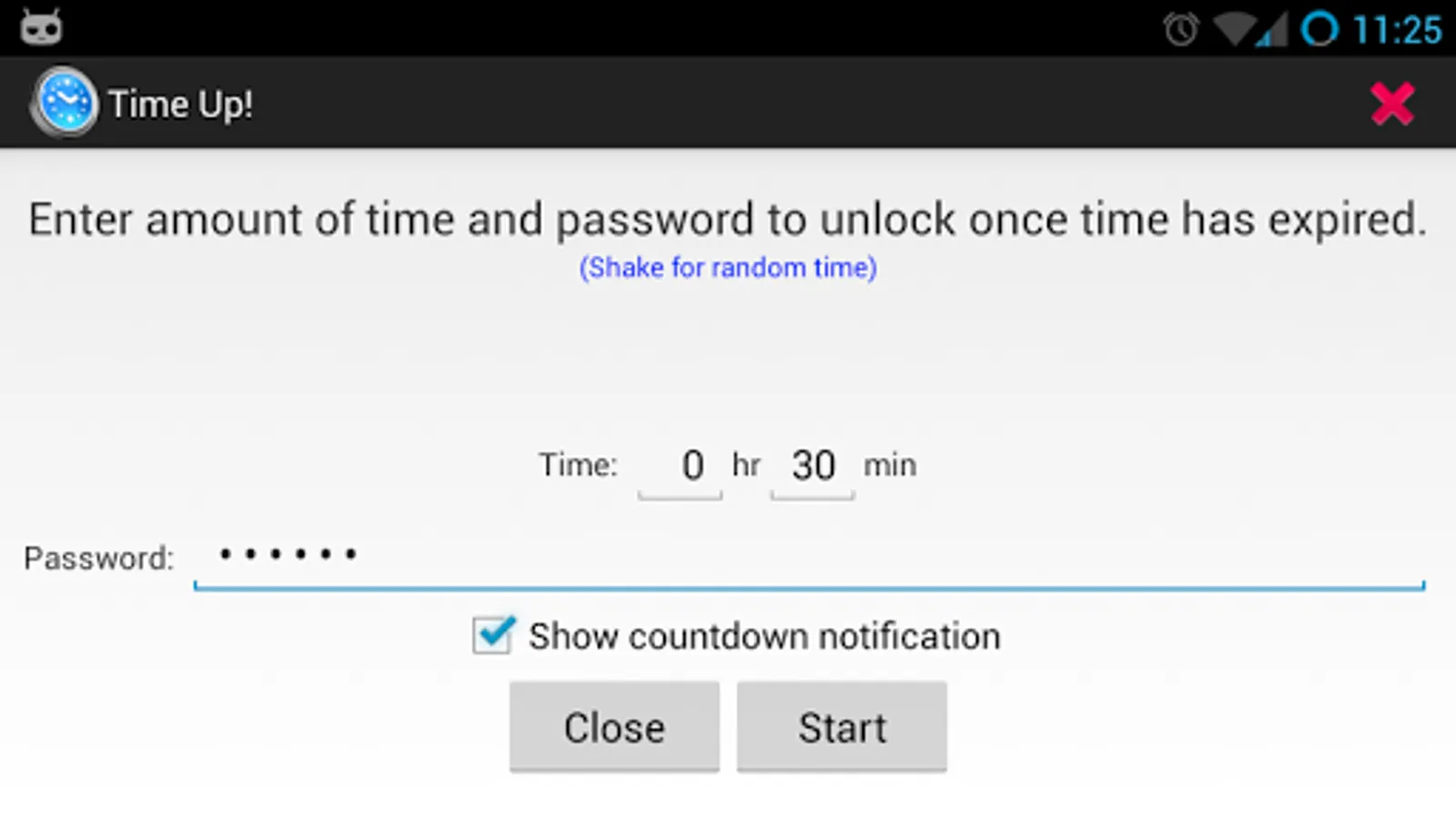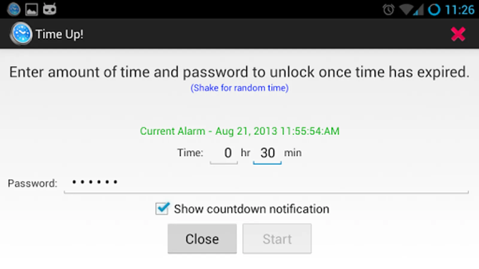 To Use: Click on the Kid Phone Timer app, enter the time and choose a password. Then click the start button. Once the time you set has expired, the Time Up! screen pops up and the password must be re-entered to clear the message.