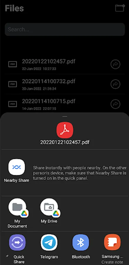 My Scanner is a document scan for PDF file. You can scan your document and share to anyone on social media like Telegram, Email, Line, Google Drive and other Apps.