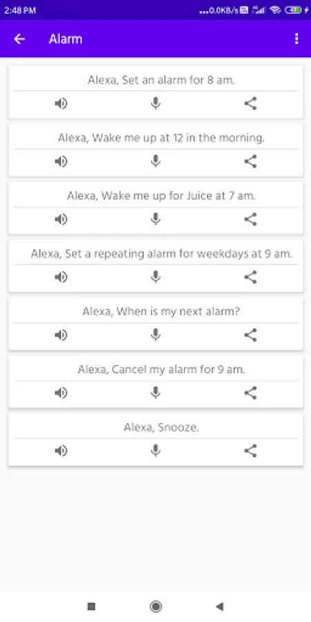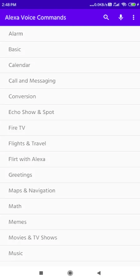 This app provides a full list of voice commands for Amazon Alexa Mobile and Echo Home devices, smart speakers that activates by special phrase Alexa. All voice commands are categorized into multiple categories.