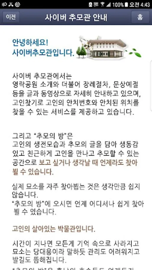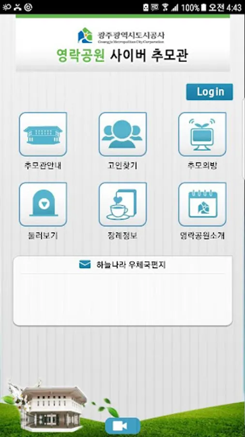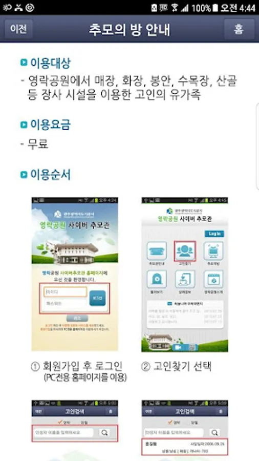 Gwangju Youngnak Park Cyber Memorial App consists of finding the deceased, memorial room, introduction of major graveyards and major facilities, funeral information, and introduction of Youngnak Park.