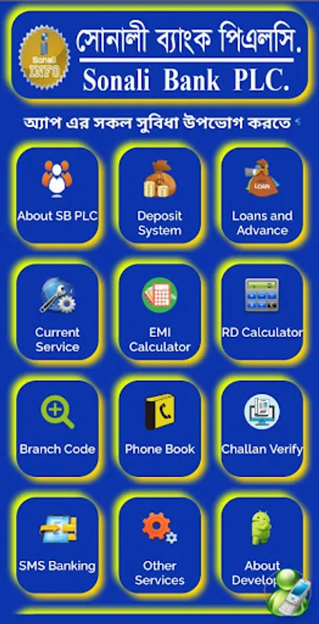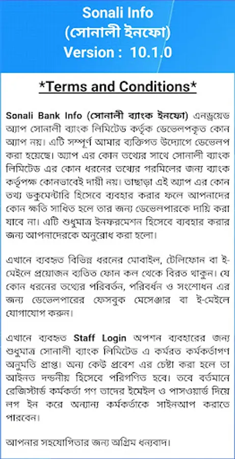 সোনালী ইনফো অ্যাপ শুধুমাত্র তথ্য জানার জন্য। এখানে ব্যাংকিং কোন সার্ভিস প্রদাণ করা হয় না। এই অ্যাপ এর কোন তথ্য বিভ্রাট থাকলে তার জন্য ব্যাংক কর্তৃপক্ষ দায়ি নয়।