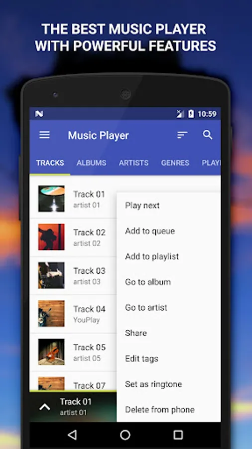 Scan of all your local songs and music files then list it by albums, artists, genres, playlist and folders.