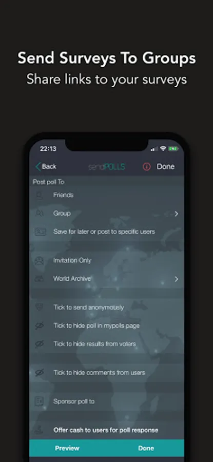 Send advanced polls and surveys to the mobile phones of friends, GROUPS, anyone, everyone or target a specific demographic FOR FREE !