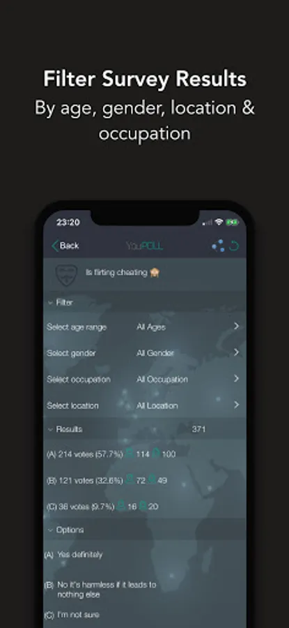 View detailed voting statistics on polls and surveys filtered by demographic data such as age, gender,location and occupation of voters
