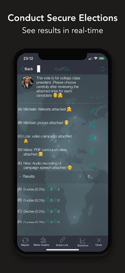 Conduct secure ELECTIONS from your mobile phone & view instant results with a gender breakdown; voters vote from their mobile phones
