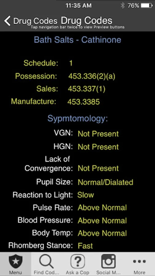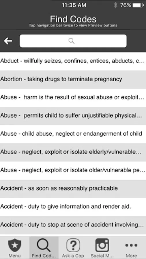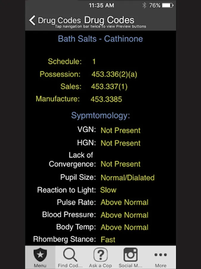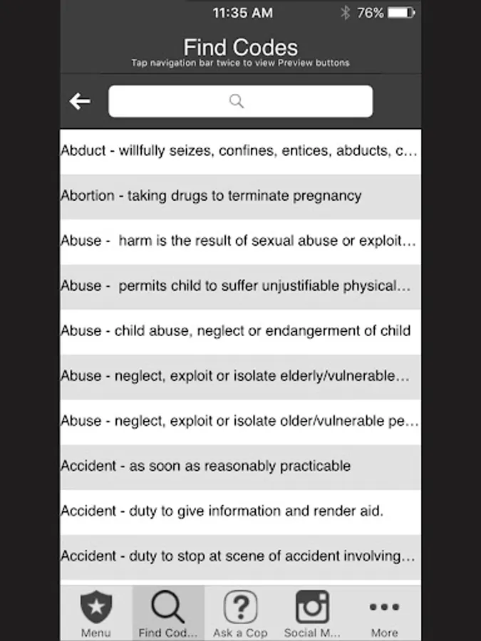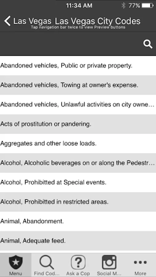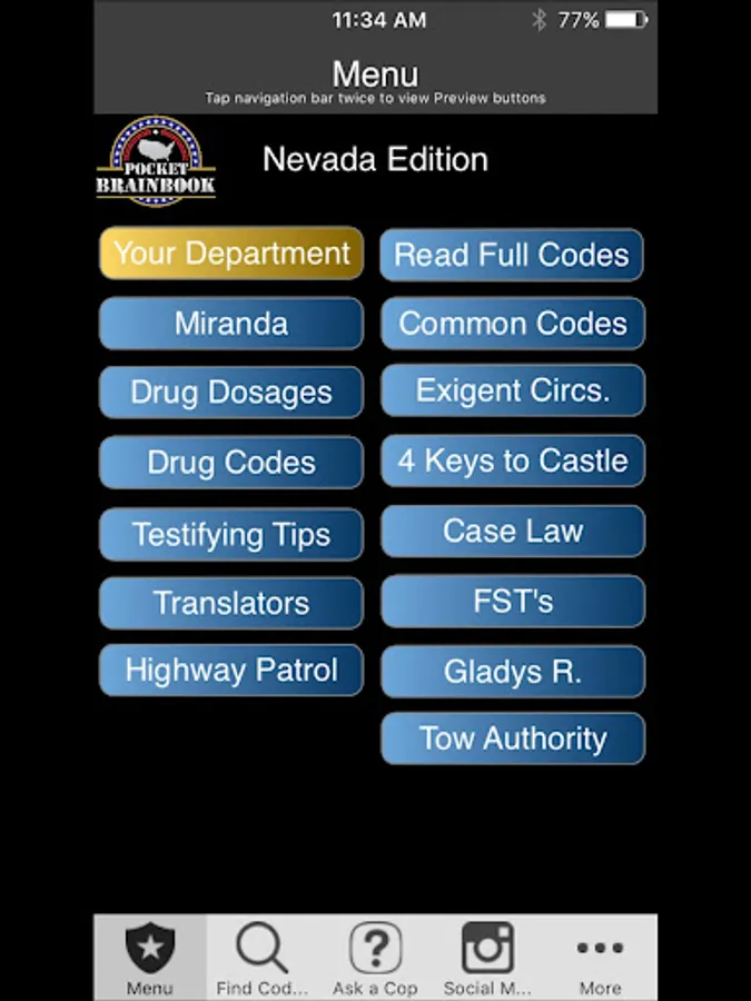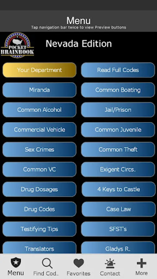 Designed for Nevada Police. This app was designed based on our popular pocket book version currently sold in NV police stores. You can search Penal, Traffic, ABC, Health and Safety Laws by keyword or browse Codes. It has Miranda, narcotic codes, Drug symptomology domestic violence codes, translator cheat sheets for 6 different languages, vehicle theft info, and so much more. We have also included a custom section to add your own department information (ie. Municipal codes, radio codes, policies, etc.) This app can also be customized to your specific Police Department.