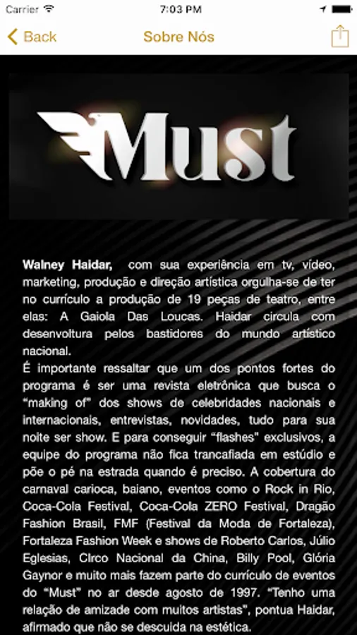 Walney Haidar, Entrepreneur and theater actor, he tells how the idea of creating a social columns show on the small screen. "It has a bit of everything: music, health, theater, society, tourism, fashion, beauty, beauty," he says. The "Must" is the proposal to show only beautiful things. That is, the fascinating universe of stars lending their dreams end to the imagination of ordinary people. The Must differentials are interviews with famous artists interspersed with informative materials, commercial giving greater visibility to products placed strategically very clever subtlety and witness reaching the goal of every client.