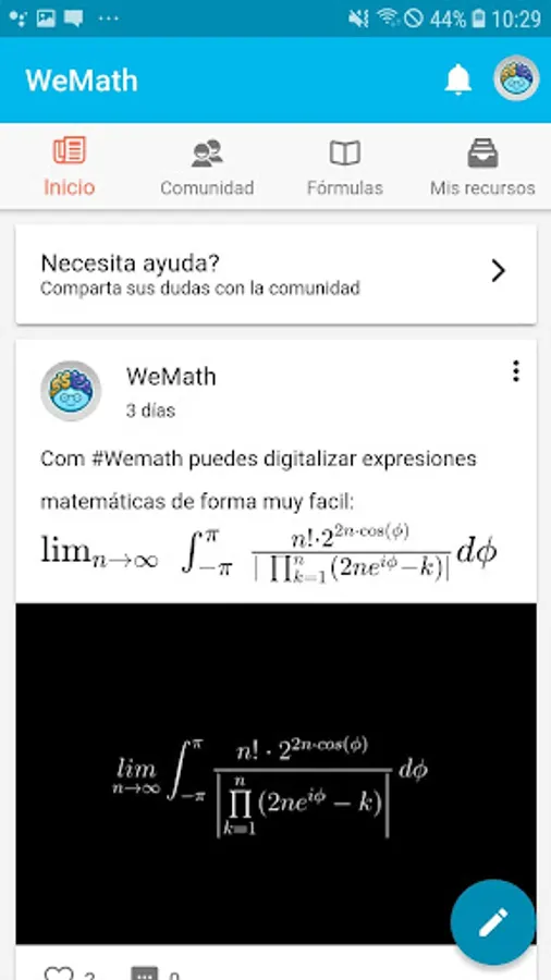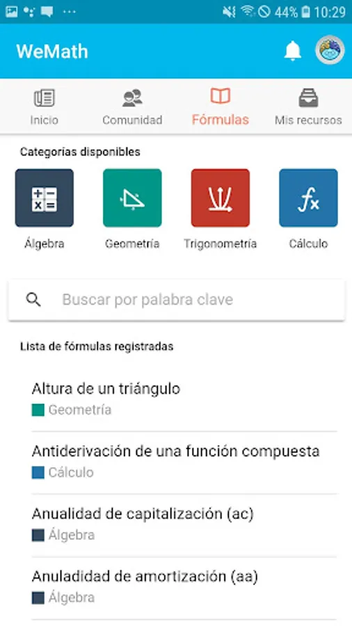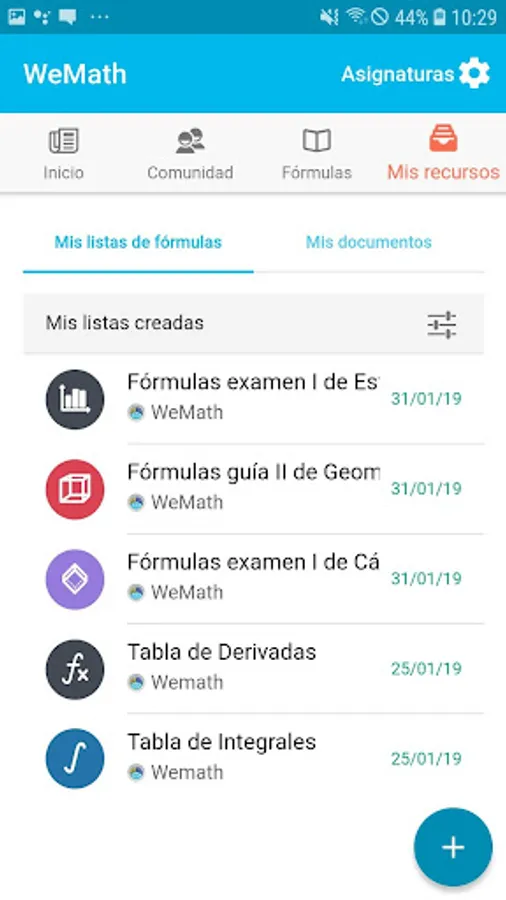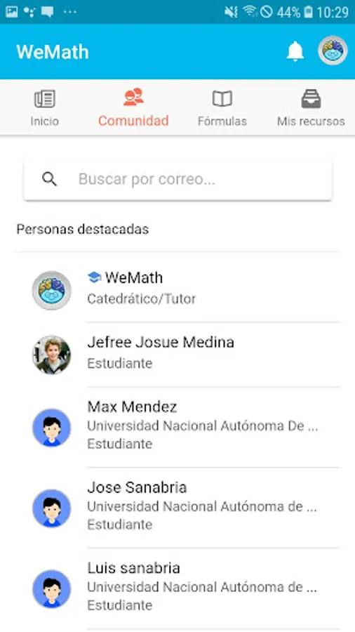 WeMath is a mobile application for students, professors and tutors of the areas related to mathematics, physics and chemistry in which all form an educational community and which serves as an excellent tool for learning processes, in which they can administer all those educational resources that they use in their classes such as: guides, guidelines, jobs, etc.
