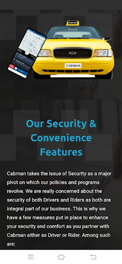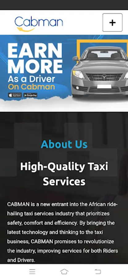 CABMAN is a new entrant into the African ride-hailing taxi services industry that prioritizes safety, comfort and efficiency. By bringing the latest technology and thinking to the taxi business, CABMAN promises to revolutionize the industry, improving services for both Riders and Drivers.
