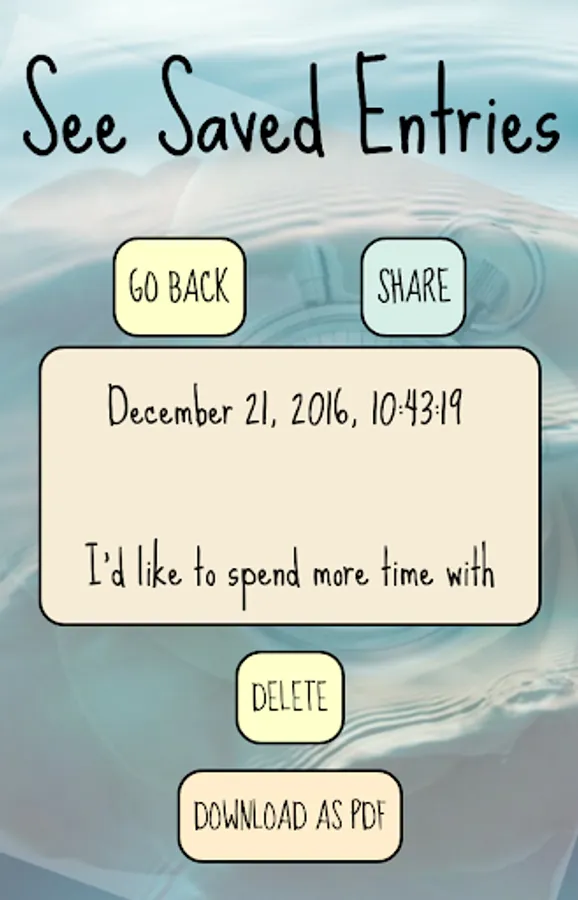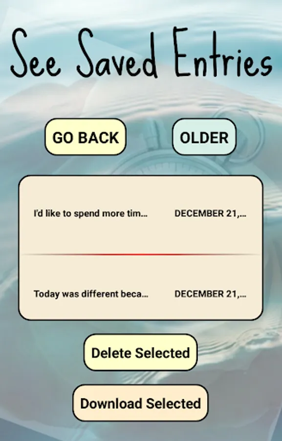 To review your previous entries, select See Saved Entries. From there, you can select your entries to download, share, or delete. Your saved entries will automatically display with the newest at the top. To sort with the oldest on top, click the "older" button. Hold your finger on one of the prompts on the list and you will see check boxes appear to the left. Select those that you'd like to download or delete, and touch the download or delete button.