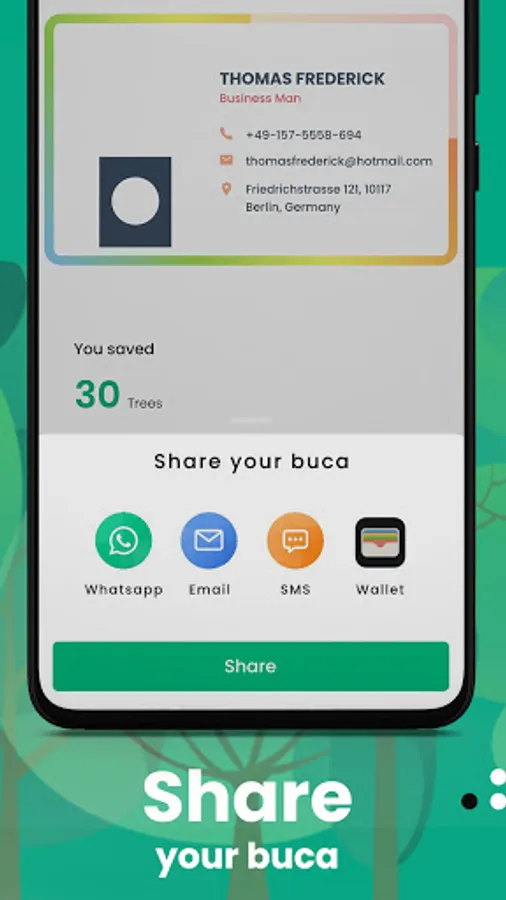 Here, we call business cards BUCA's! As cool as it sounds, the app offers countless new options to share the business card with others. Use the QR Code scanner or link sharing option to share your online business card with anyone.