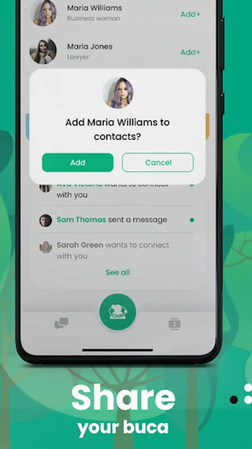 • Use the BUCA Connection finder to find nearby BUCA users and connect with new professional contacts