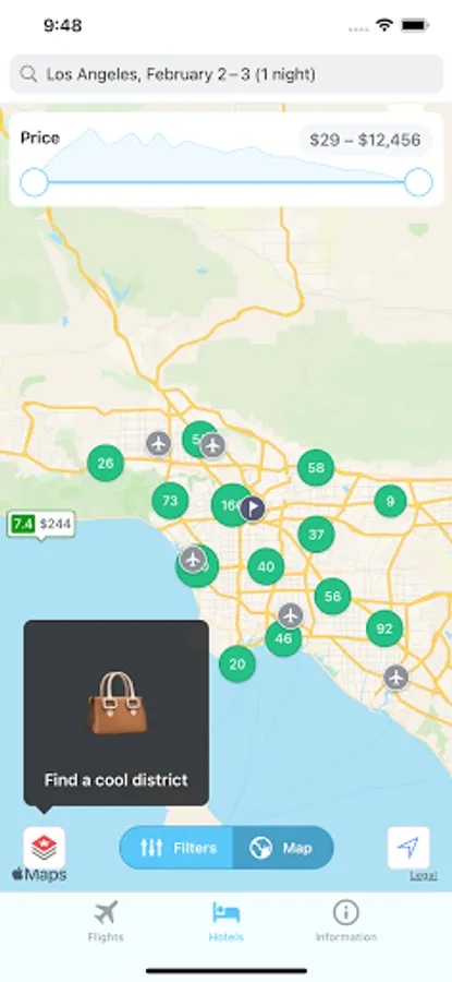 With the help of iTraveler you can find and compare the cheapest flight tickets and hotel deals directly on the interactive map within the shortest time possible.