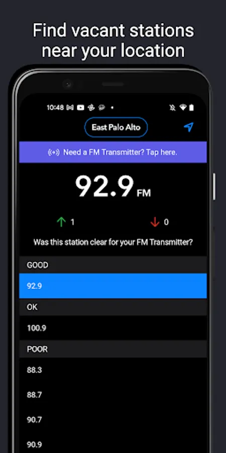 WELL NOW, there's an easy way to find exactly which station is the clearest for your FM Transmitter and you can constantly update your location so your music will always remain playing with no interruption.
