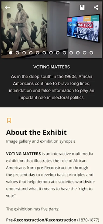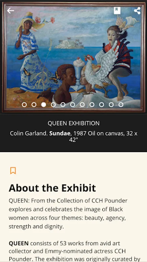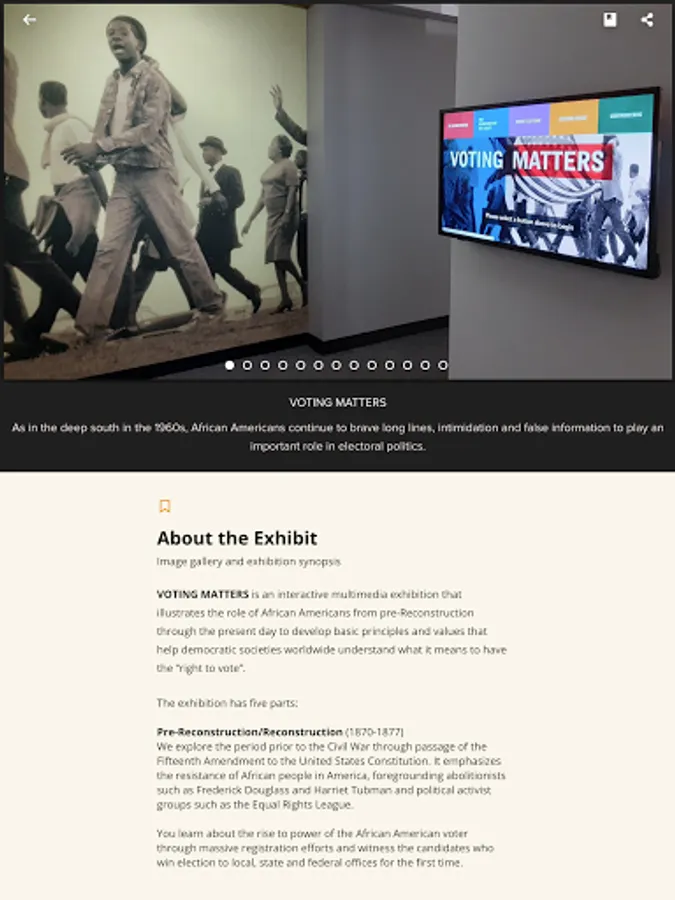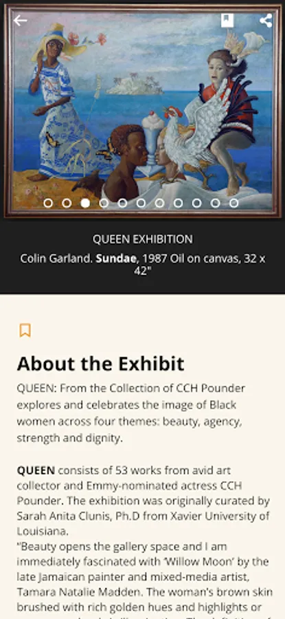 The initial five shows featured are: QUEEN: From the Collection of CCH Pounder; VOTING MATTERS: African Americans and the Vote; The Art of Samuel A. Hodge; Portal of Sankofa: Adinkra Doors; Ibrahim Mahama, In-Between the World and Dreams. Each exhibition has two or three pathways: (1) a rich image gallery, (2) an audio only overview, (3) and short, annotated descriptions of select artifacts.
