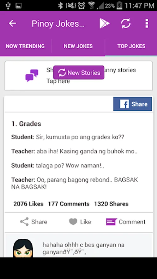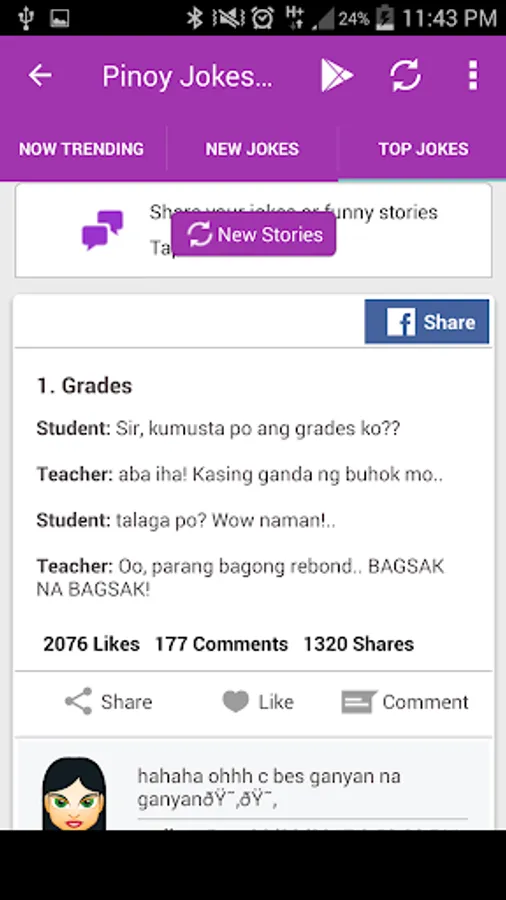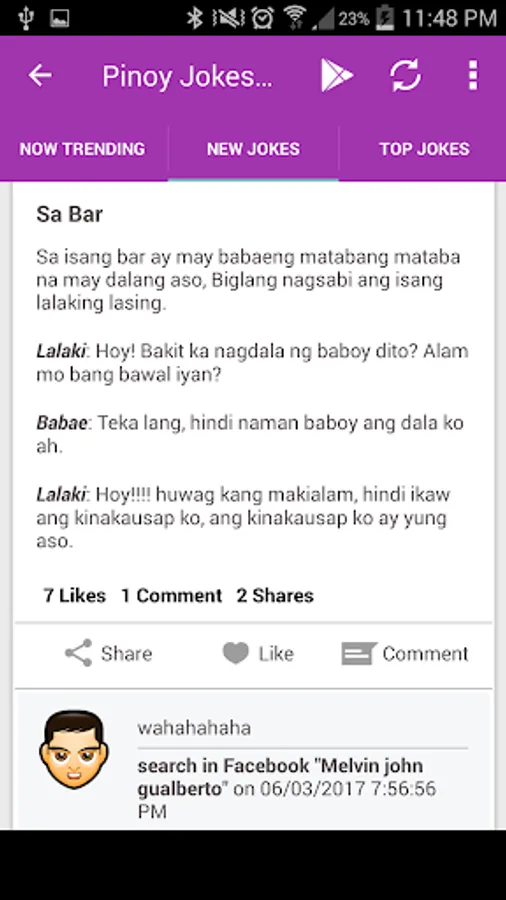 Pinoy Jokes Extreme is now available for all filipino's worldwide. Surely you'll enjoy reading jokes from this app. With a single tap you can instantly share it to your facebook wall. Pinoy Jokes Extreme is updated regularly so you get new funny jokes every day.