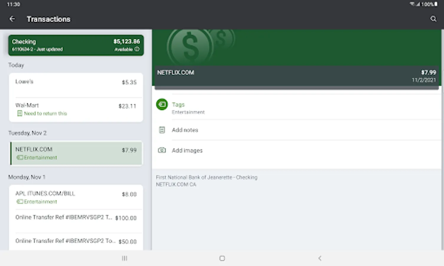Keep your transactions organized by allowing you to add tags, notes and photos of receipts and checks.