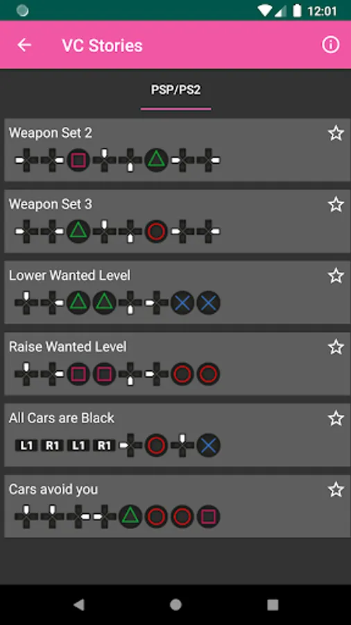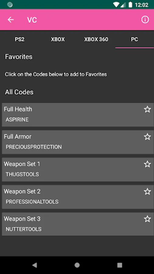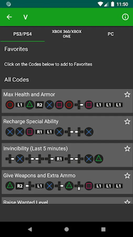 App with cheat codes for various open world games and with functionality to create Favorites list.