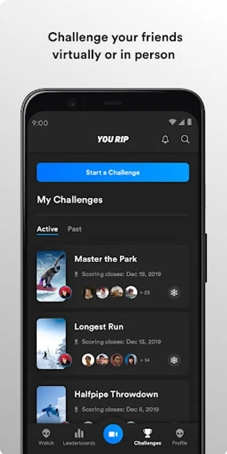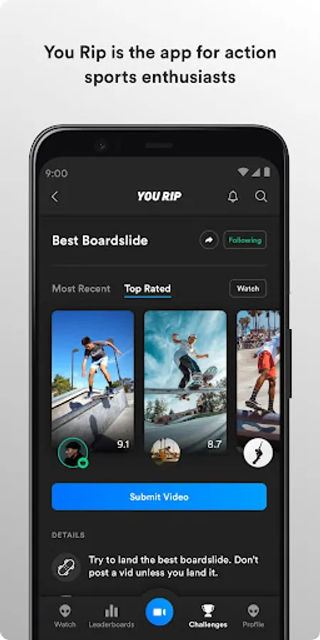 • Submit videos that meet the challenge criteria, and compete for ratings - with the results ultimately determined by other You Rip users.