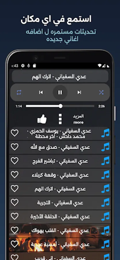 نقدم أفضل وأسهل تصميم للحصول على أسرع تجربة و الاستماع إلى المنشد المفضل لديك عدي السفياني دون اتصال بالإنترنت.