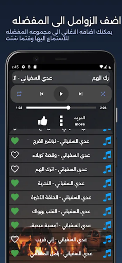 لقد سهلنا عليك اختيار الأغاني المفضلة لديك من بين العديد من الأغاني بضغطة زر واحدة ، حتى تتمكن و العودة متى أردت الاستماع إليها بشكل منفصل من خلال قسم المفضلة.