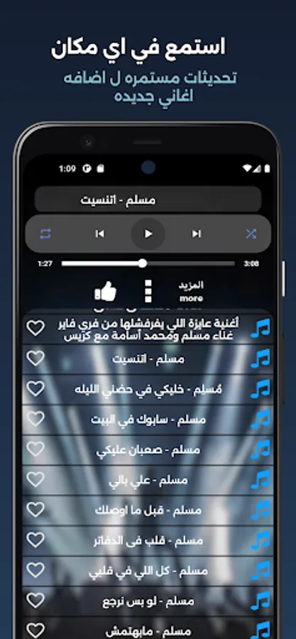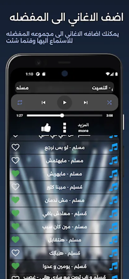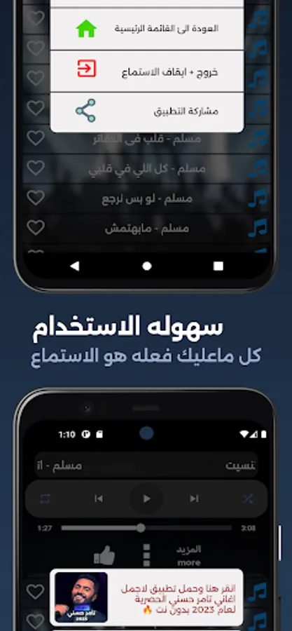 الاستماع إلى مسلم لن يأخذ منك أي جهد ، كل ما عليك فعله هو تحميل والاستماع إلى أفضل أغاني المطربين والفنانين المفضلين لديك بنقرة واحدة.