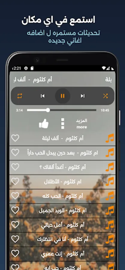 الاستماع إلى الفنان ام كلثوم لن يأخذ منك أي جهد ، كل ما عليك فعله هو تحميل والاستماع إلى أفضل أغاني المطربين والفنانين المفضلين لديك بنقرة واحدة.