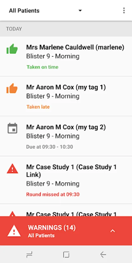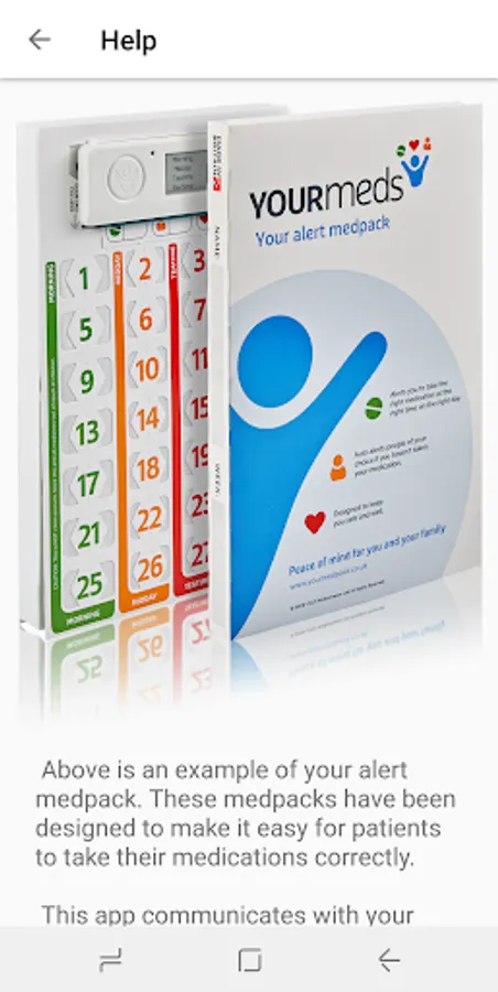 The YOURmeds app used with the YOURmeds system (see www.yourmedpack.co.uk), reminds patients when to take their medications. If the patient forgets to take their medication, the app will also notify your connected friends and family creating a support network around the patient. Open the app at anytime to view the patient’s taken, overdue and missed events along with the next expected events.