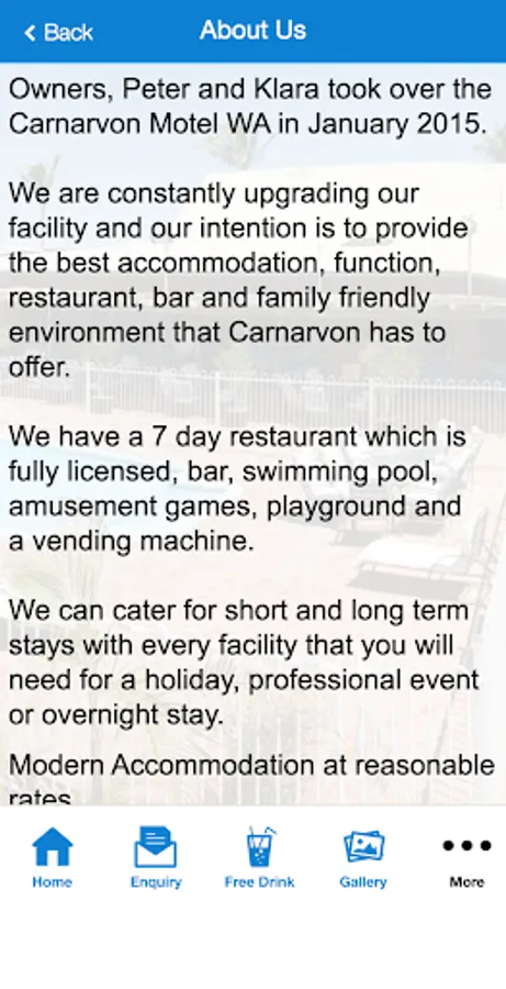 The Carnarvon Motel App gives users the ability to receive information at their tips, make a food and drink order, Access to the latest menus and specials, motel information, access to our generous loyalty program, coupons and more.