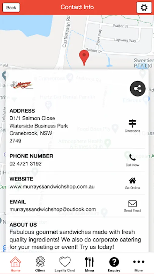 Murray's Sandwich Shop offer fabulous gourmet sandwiches made with fresh quality ingredients! We have been serving great gourmet sandwiches in Penrith for the last 20 years. We also do corporate catering for your meeting or event! Try us today! Download our App today to receive push notifications, place an order, easily contact us, access our up to date menu and more.
