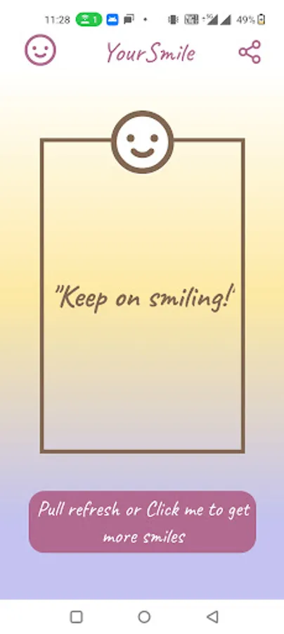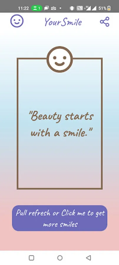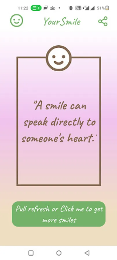This is an app that gives you a randomly picked up smile quote on refreshing the screen and/or clicking a button. You can also share the quote with your friends using the share button