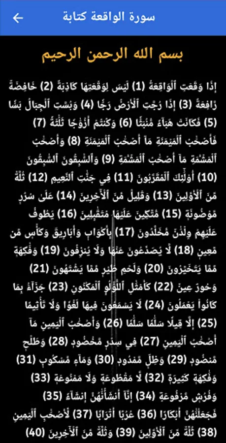 * Features of the application of Surat Al-Waqi’ah in writing and audio without the net *