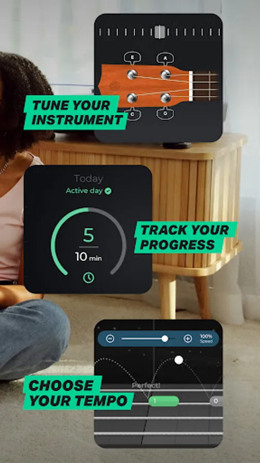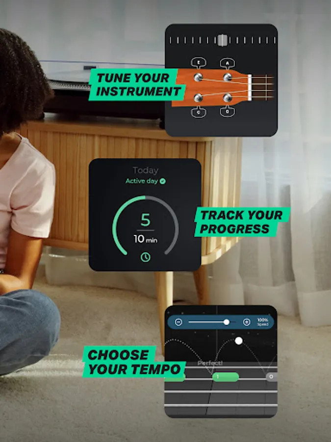 • Learn and master skills like chords and strumming with step-by-step lessons