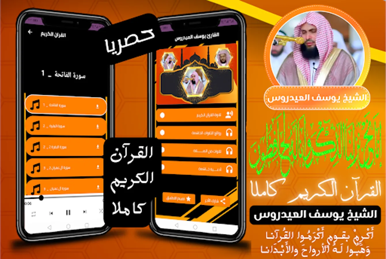 It is known that the reciter Youssef Al-Aidarous has a beautiful and wonderful voice that fills him with tranquility and calmness and takes you to another world of tranquility and psychological comfort. The voice of Sheikh Youssef Al-Aidarous must leave a beautiful impact on yourself and the application will help you to know the virtue of the Holy Qur’an over all speech and also the preference of persevering in reciting the Qur’an and listening To reciting the Noble Qur’an, and we hope that the reader application, Youssef Al-Aidarous, will help you download the Noble Qur’an in that and will help you in downloading and memorizing the Noble Qur’an with the voice of Sheikh Youssef Al-Aidarous
