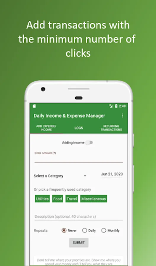 1. A list of frequent categories used by you (separate for expenses and income), which keeps getting updated as you add more and more transactions, saving you the time to select the category for majority of the daily transactions