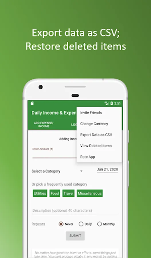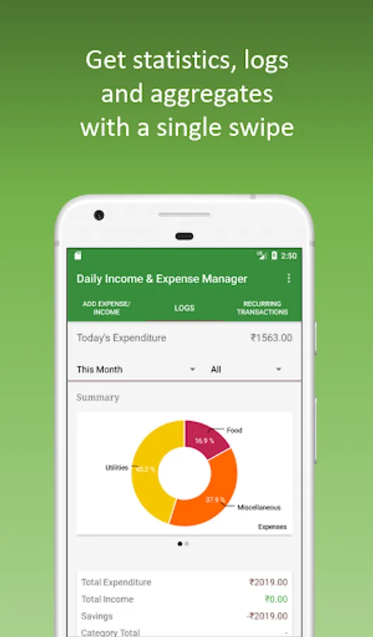 And don't worry at all about data-privacy. All the expenses/incomes entered by you are only stored on your phone and not shared over the internet. They get deleted as soon as you uninstall the app. Also, DIEM does not require you to login. So there is no personal information that you share with the app.